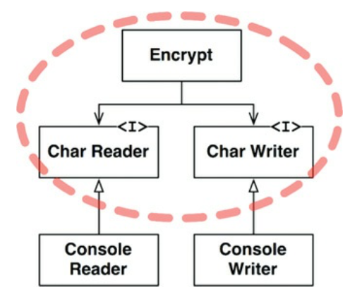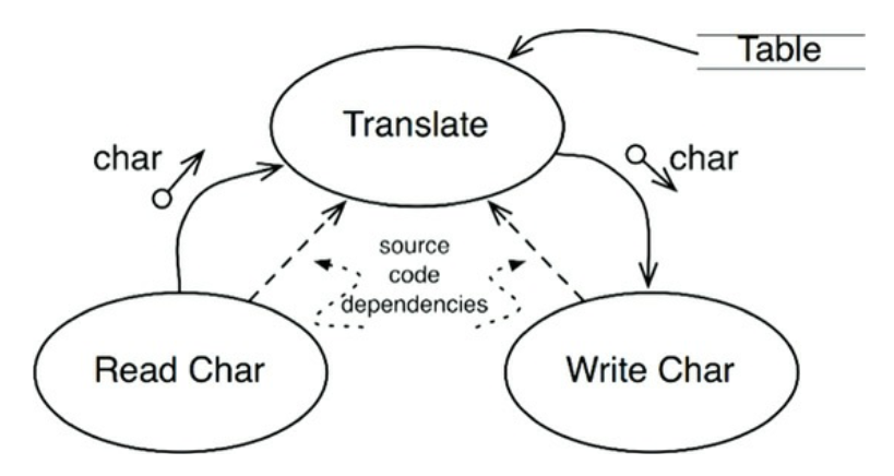 고수준인 encrypt 함수가 저수준인 readChar와 writeChart 함수에 의존하기 때문에 잘못된 아키텍처.