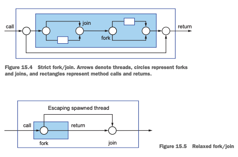 15장에서는 사용자의 메서드 호출에 의해 스레드가 생성되고 메서드를 벗어나 계속 실행되는 동시성 형태이다