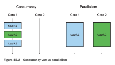 동시성은 단일 코어 머신에서 발생할 수 있는 속성으로 실행이 겹칠수 있으나