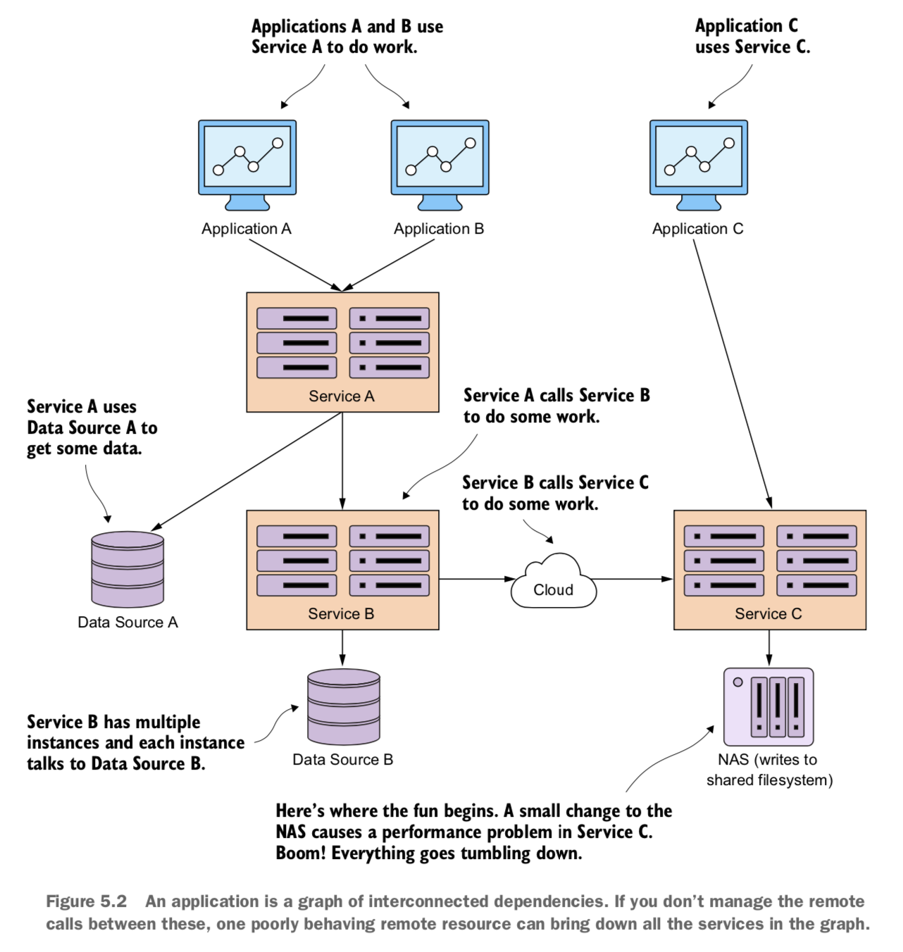 - 성능이 나쁜 서비스 하나가 호출을 완료할 때까지 호출 클라이언트를 대기시키므로 연쇄적인 자원고갈을 유발함