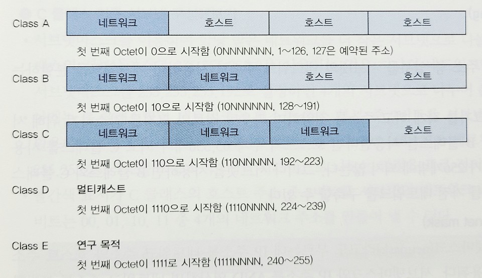 바이트 값에 따라 A,B,C 일반목적 클래스 D,E 특수목적 클래스
