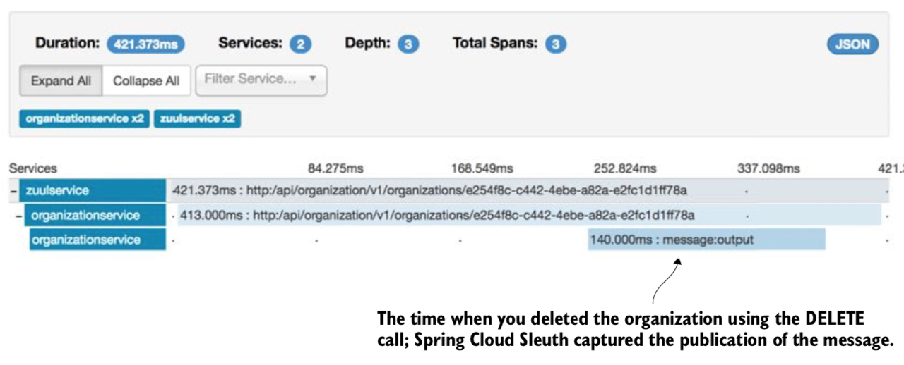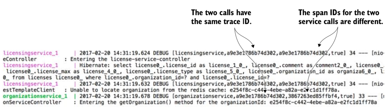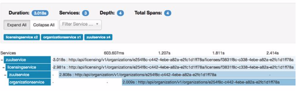라이선싱 서비스와 조직서비스가 동일한 추적 ID를 공유하나 스팬 ID는 다르다.
