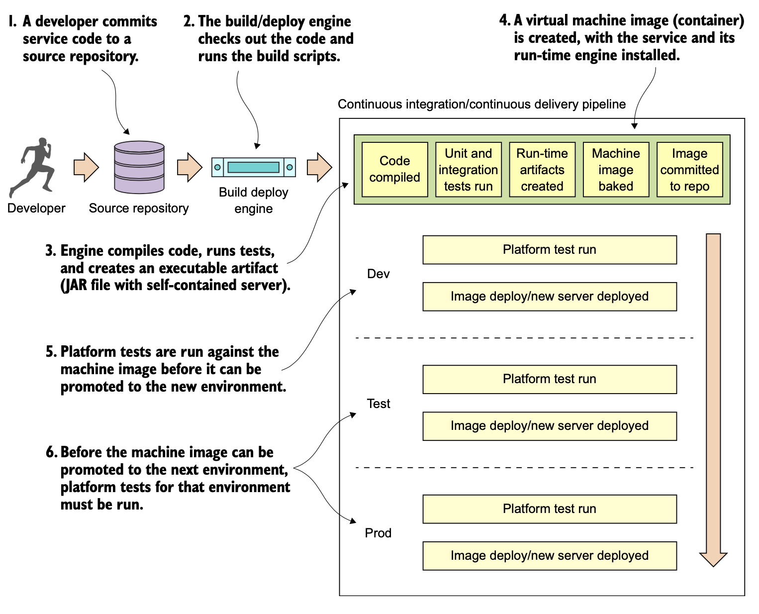 하나의 상호의존단위로 배포하고 개발팀이 관리 - 새 환경에 배포전 실행 이미지에 대해 플랫폼 테스트를 수행해 정작 작동하는지 확인후 머신이미지 사용.