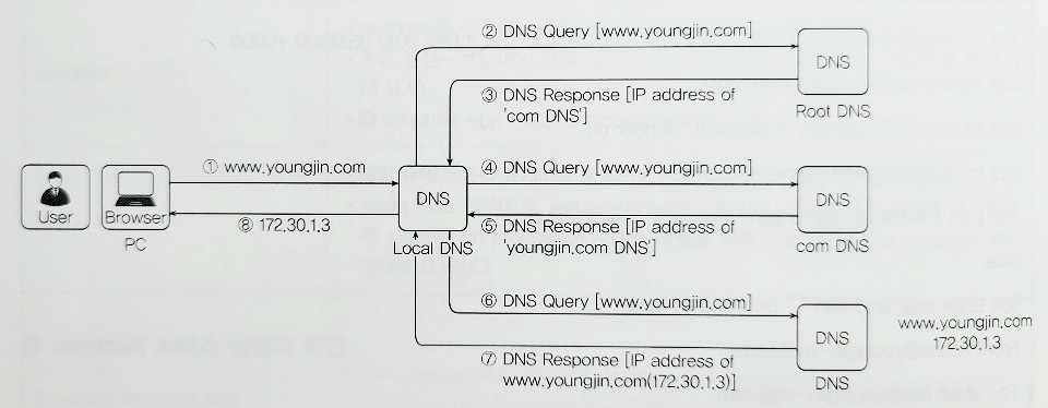 6,7 - Local DNS는 www.youngjin.com을 관리하는 DNS에 질의하고 관련 정보가 있을경우 IP 주소를 응답 받음.
