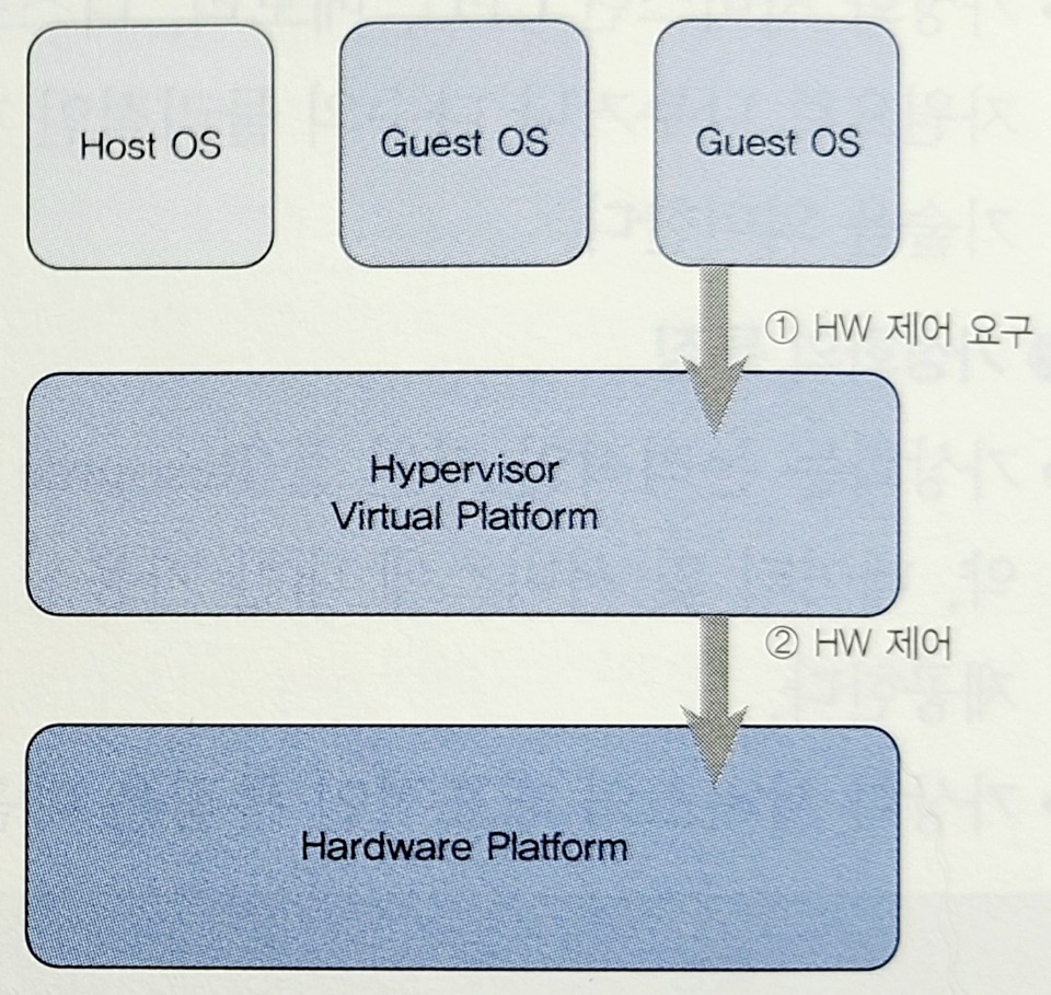 - VMM(Virtual Machine Monitor) 이 물리적인 하드웨어를 가상머신의 하드웨어와 매핑하고,