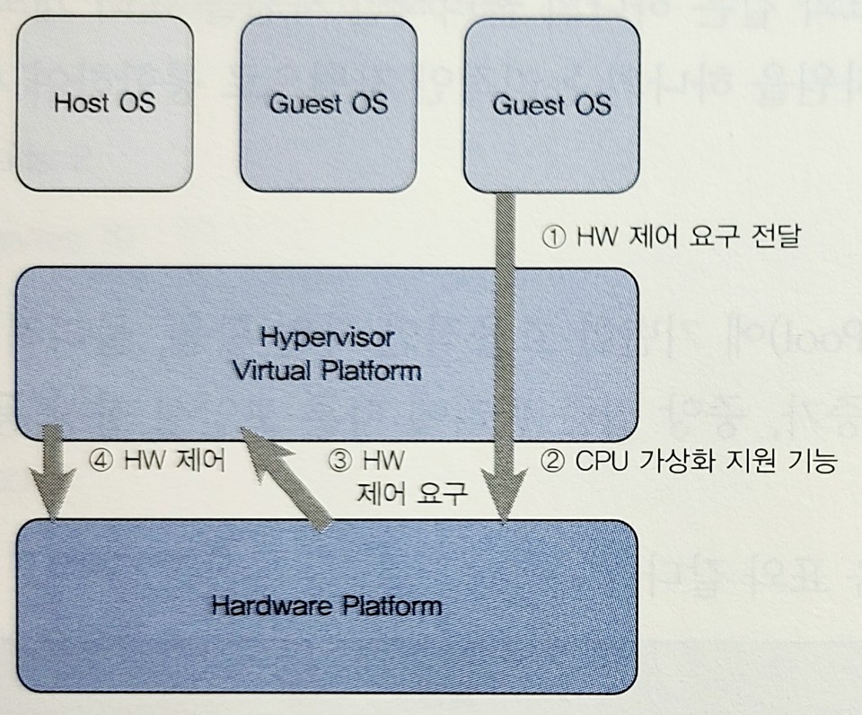 게스트 OS는 하이퍼바이저에 하드웨어의 제어를 요청하여 동작. 하이퍼바이저가 하드웨어 사용을 통제하므로 상대적으로 높은 성능을 제공. 게스트 OS의 수정이 필요하여 리눅스 등 오픈소스가 주로 지원. |