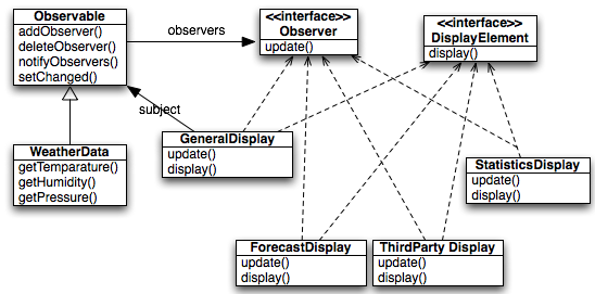 주제(Subject) 인터페이스와 옵저버 (Observer) 인터페이스가 들어있는 클래스 디자인을 바탕으로 한다.