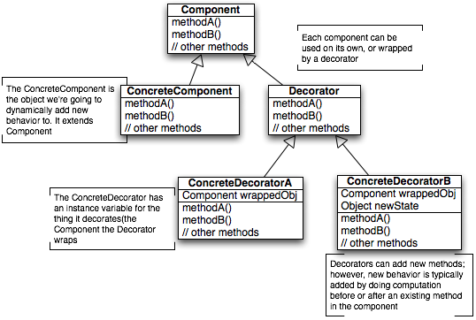 Decorator - component 객체가 들어있다. 구성요소에 대한 레퍼런스가 들어있는 인스턴스 변수를 가짐.