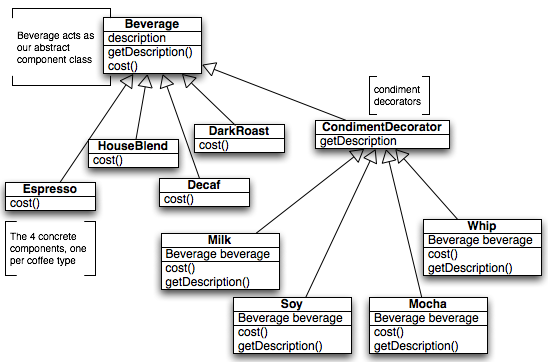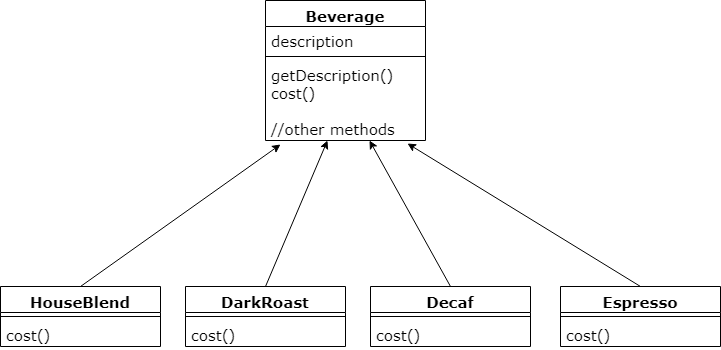 Beverage 클래스는 추상클래스이며 각 서브클래스에서 description 인스턴스 변수와 cost() 를 구현한다.