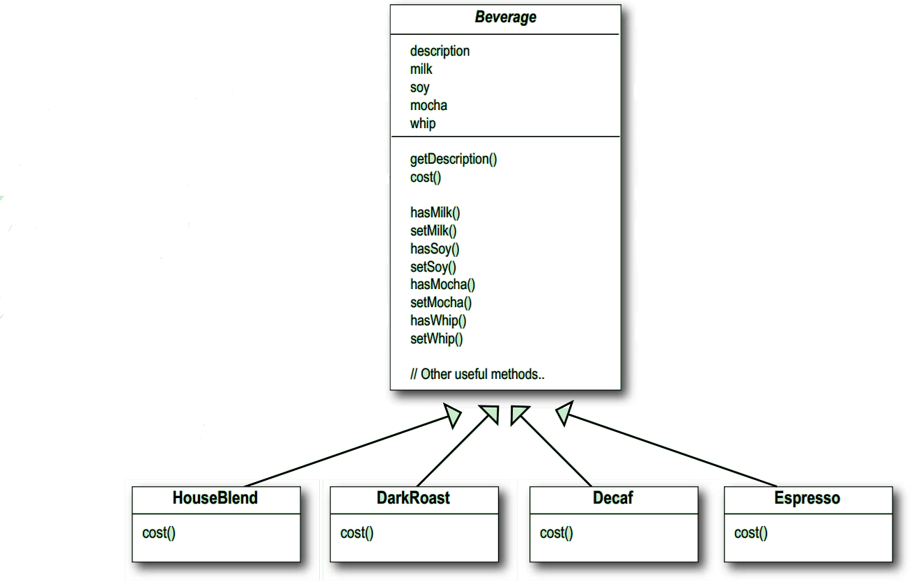 첨가물의 종류가 많아지면 메소드를 추가해야하며, 수퍼클래스의 cost()메소드도 고쳐야 한다.