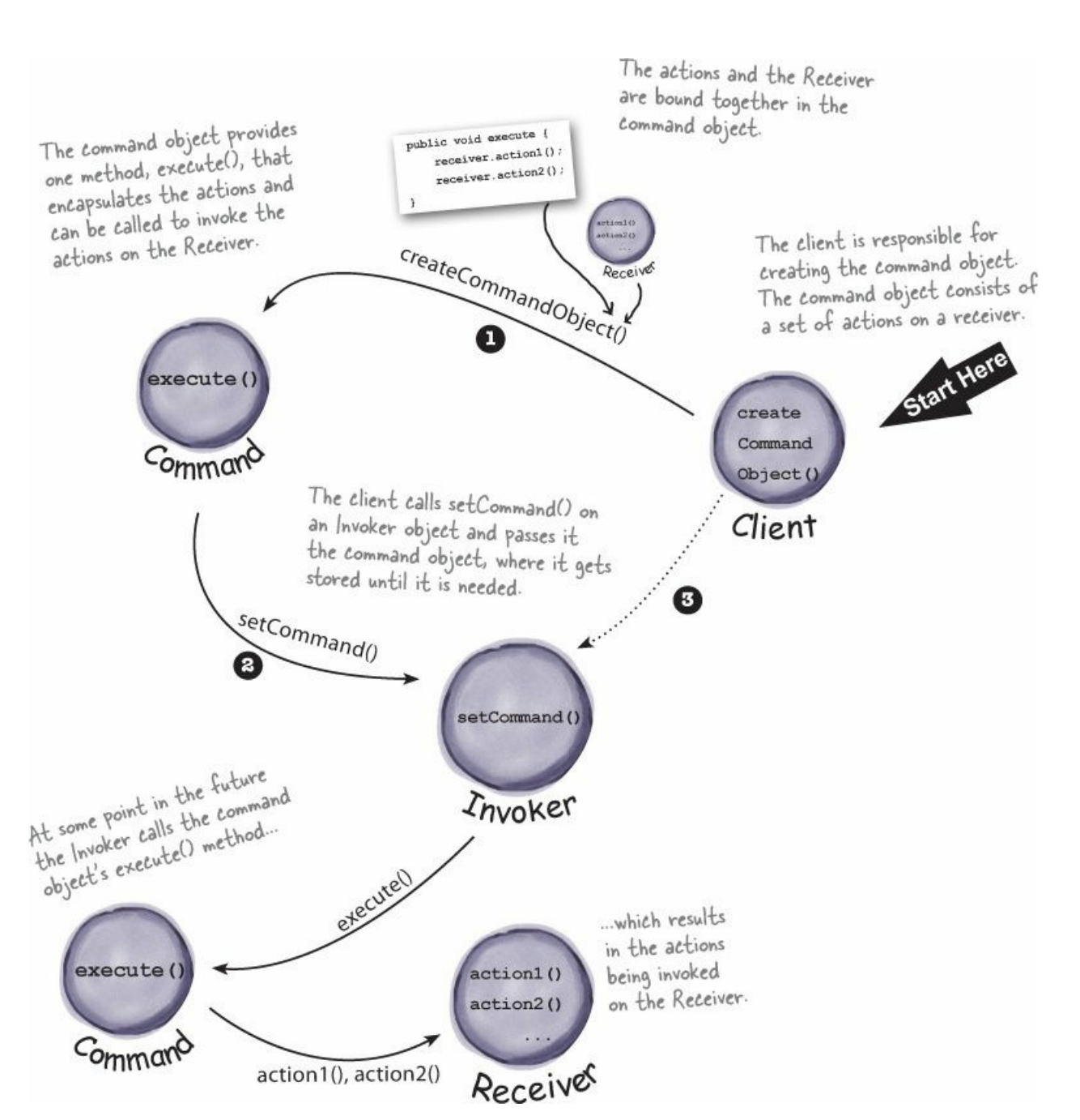 인보커에서 커맨드 객체의 execute() 메소드를 호출하면, 리시버에 있는 특정 행동을 하는 메소드가 호출.
